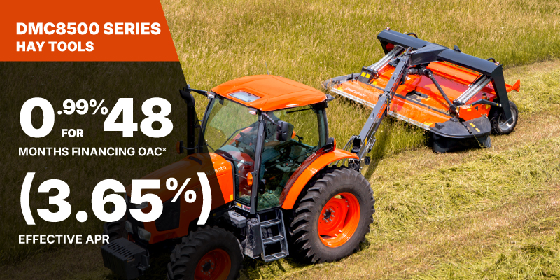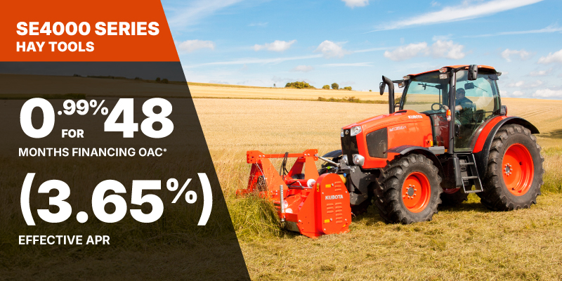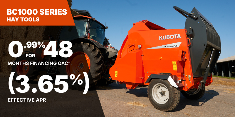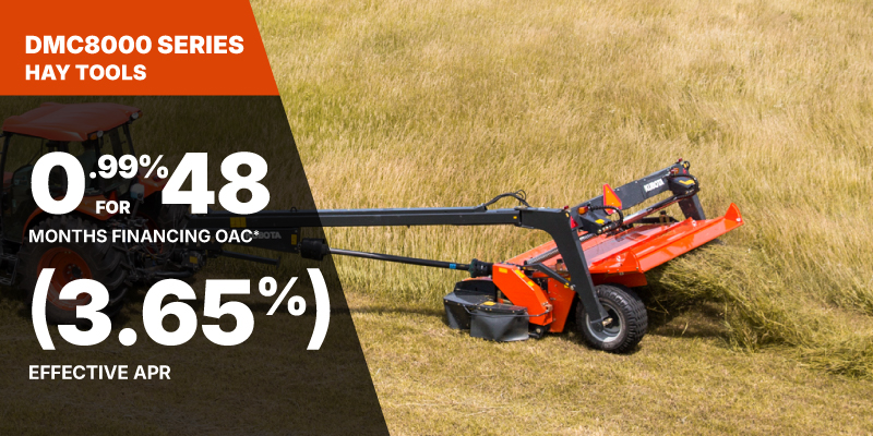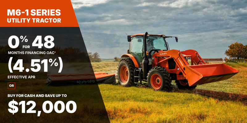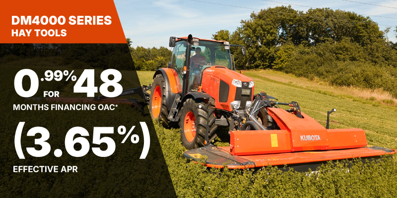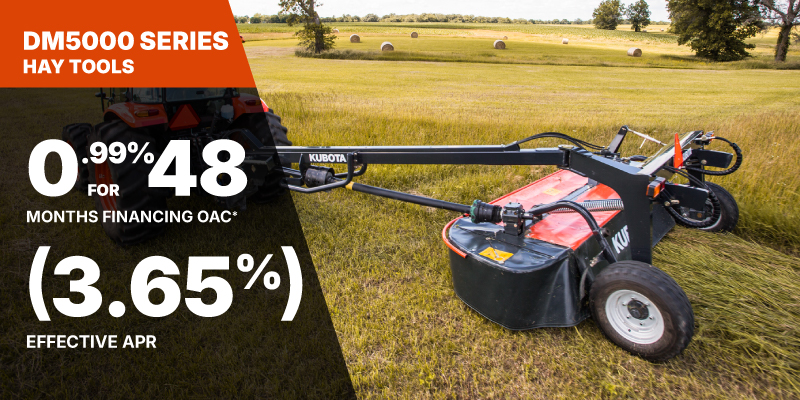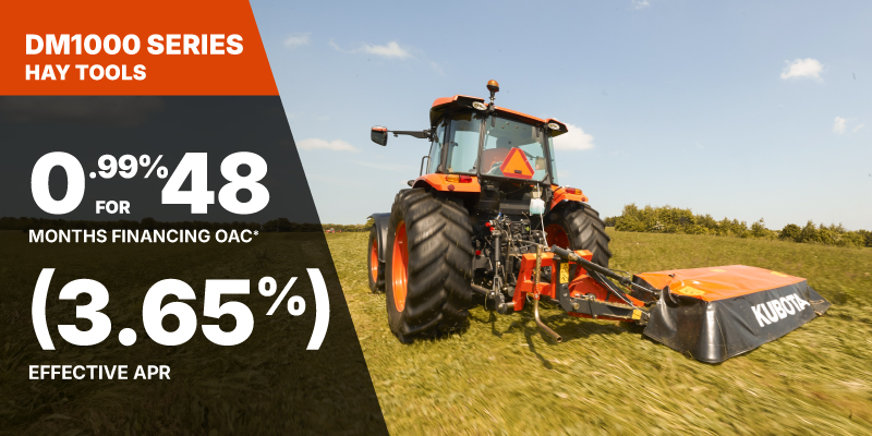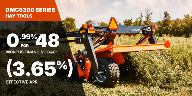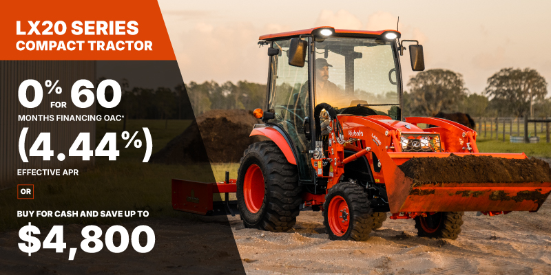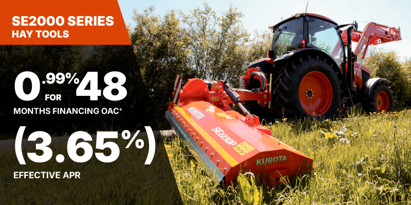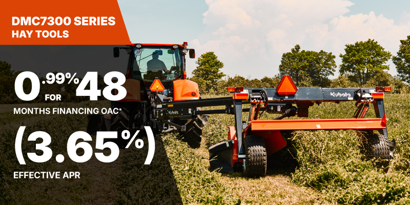 *For all offers: Prices and payments include freight and other applicable fees (including environmental fees, administration fees, set-up fees, and dealer fees). Taxes, delivery fees, insurance and registration are extra. Dealer may sell for less. Dealer order/trade may be necessary (but may not be available in all cases). Some restrictions apply. Offers valid only at participating dealers in Canada and are subject to change, cancellation or extension at any time without notice or obligation. Minimum down payment of 10% required for financing offers on turf and agricultural products. Specifications, features, illustrations and equipment shown are based on the latest available information at the time of publication. Some models are shown with optional accessories available at extra cost. Although descriptions are believed to be correct, accuracy cannot be guaranteed. We reserve the right to make changes at any time, without notice or obligation to specifications, accessories, materials, models, prices, payments and other information. Offer valid until June 30, 2026. See your participating Kubota dealer or visit www.kubota.ca for complete details