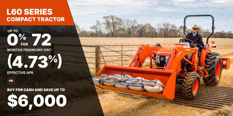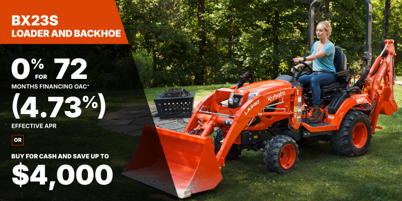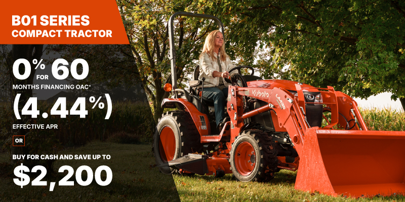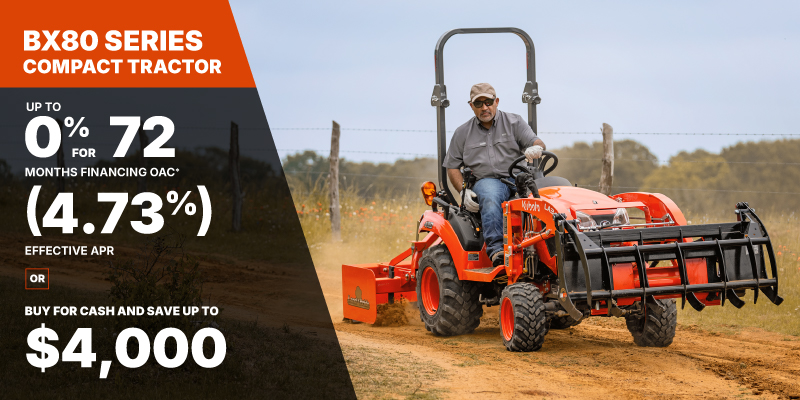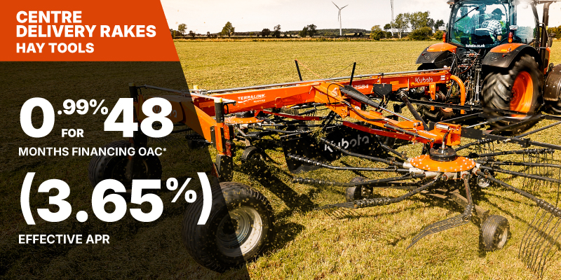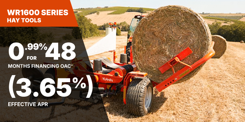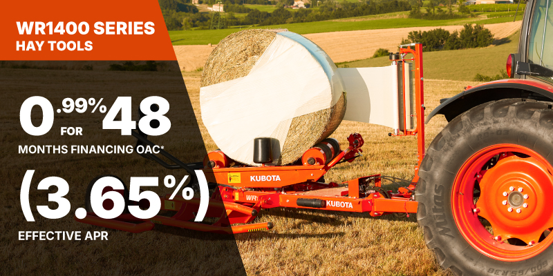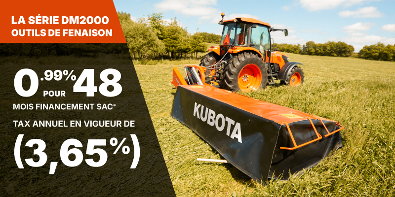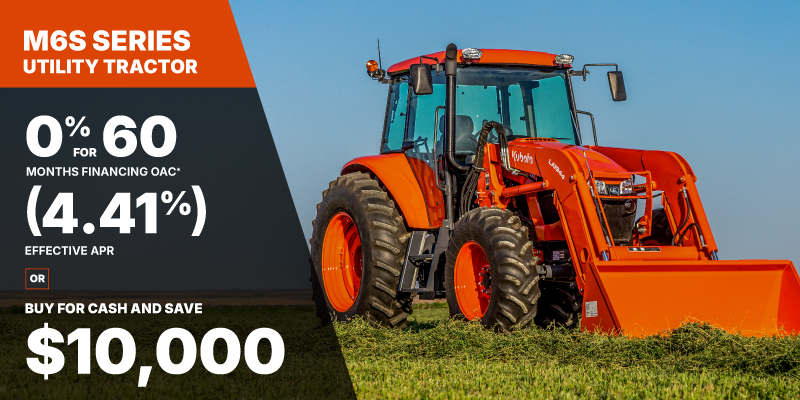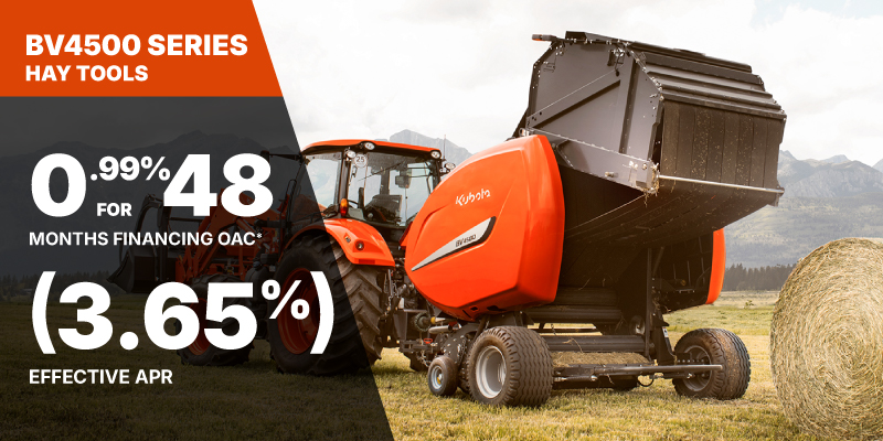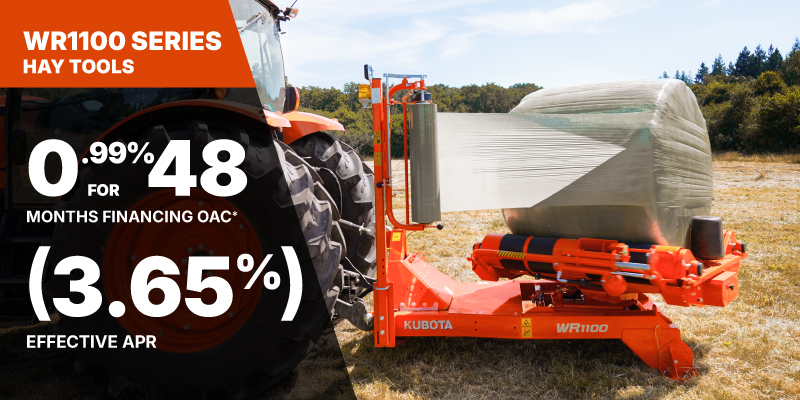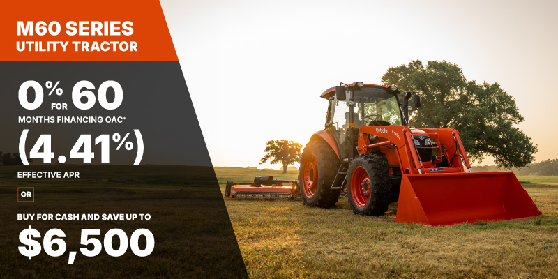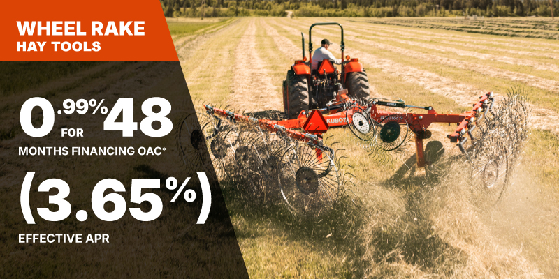 *For all offers: Prices and payments include freight and other applicable fees (including environmental fees, administration fees, set-up fees, and dealer fees). Taxes, delivery fees, insurance and registration are extra. Dealer may sell for less. Dealer order/trade may be necessary (but may not be available in all cases). Some restrictions apply. Offers valid only at participating dealers in Canada and are subject to change, cancellation or extension at any time without notice or obligation. Minimum down payment of 10% required for financing offers on turf and agricultural products. Specifications, features, illustrations and equipment shown are based on the latest available information at the time of publication. Some models are shown with optional accessories available at extra cost. Although descriptions are believed to be correct, accuracy cannot be guaranteed. We reserve the right to make changes at any time, without notice or obligation to specifications, accessories, materials, models, prices, payments and other information. Offer valid until June 30, 2026. See your participating Kubota dealer or visit www.kubota.ca for complete details