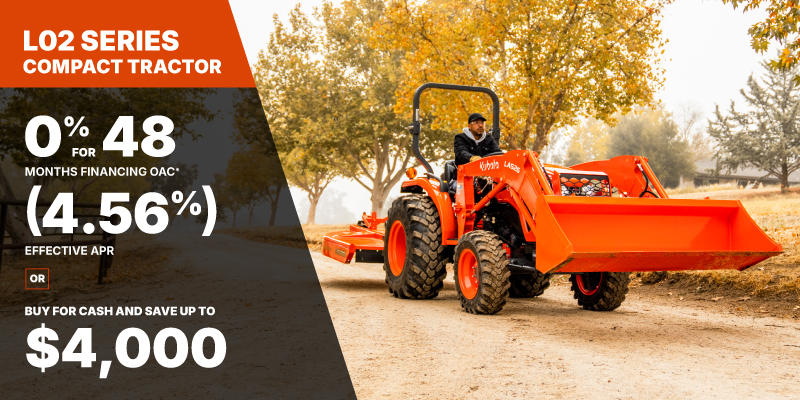 L02 Representative finance example for the L2502 : $29,036.31 financed at 0% (4.56% effective APR which factors in $2,460.88 in non stackable cash that cannot be combined with finance offers) equals $273.03 bi-weekly for 48 months. 104 payments required bi-weekly for 48 months. $3,154.98 down payment required. Cost of borrowing is $2,460.88 for a total obligation of $29,036.31. Financing available on approved credit. Prices and payments include freight and other applicable fees (including environmental fees, administration fees, set-up fees, and dealer fees on the model specified). Rebate of $2,500 available on cash purchases of a new L2502 only. Rebate of $3,000 available on cash purchases of a new L3302 only. Rebate of $3,200 available on cash purchases of a new L3902 only. Rebate of $4,000 available on cash purchases of a new L4802 only. Offer valid until 06-30-2026.