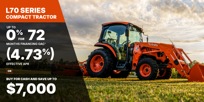 L70 Representative finance example for the L3970PRMRC: $46,812.44 financed at 0% (4.73% effective APR which factors in $5,477.06 in non stackable cash that cannot be combined with finance offers) equals $270.07 bi-weekly for 72 months. 156 payments required bi-weekly for 72 months. $4,681.24 down payment required. Cost of borrowing is $5,477.06 for a total obligation of $46,812.44. Financing available on approved credit. Prices and payments include freight and other applicable fees (including environmental fees, administration fees, set-up fees, and dealer fees on the model specified). Rebate of $4,500 available on cash purchases of a new L3970PR Rops only. Rebate of $5,000 available on cash purchases of a new L4470PR Rops only. Rebate of $4,300 available on cash purchases of a new L5070PR Rops only. Rebate of $4,800 available on cash purchases of a new L6070 Rops only. Rebate of $6,000 available on cash purchases of a new L3970PR/L6070PR Cab only. Rebate of $7,000 available on cash purchases of a new L4470PR Cab only. Rebate of $5,500 available on cash purchases of a new L5070PR/L4270DEL Cab only. Rebate of $4,800 available on cash purchases of a new L3770DEL Cab only. 0% for 72 months financing available only on a new and previously unregistered L3970PR/L4470PR Rops or Cab only. 0% for 48 months financing available only on a new and previously unregistered L5070PR/L6070PR Rops or Cab only. 0% for 60 months financing available only on a new and previously unregistered L3770DEL/L4270DEL Cab only. Offer valid until 06-30-2026.