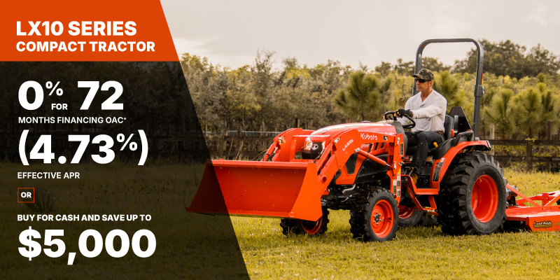 LX10 Representative finance example for the LX2610SUHSD : $26,890.13 financed at 0% (4.73% effective APR which factors in $3,146.15 in non stackable cash that cannot be combined with finance offers) equals $155.14 bi-weekly for 72 months. 156 payments required bi-weekly for 72 months. $2,689.01 down payment required. Cost of borrowing is $3,146.15 for a total obligation of $26,890.13. Financing available on approved credit. Prices and payments include freight and other applicable fees (including environmental fees, administration fees, set-up fees, and dealer fees on the model specified). Rebate of $2,600 available on cash purchases of a new LX2610 Rops only. Rebate of $3,800 available on cash purchases of a new LX3310 Rops only. Rebate of $4,200 available on cash purchases of a new LX2610 Cab only. Rebate of $5,000 available on cash purchases of a new LX3310 Cab only. Offer valid until 06-30-2026.