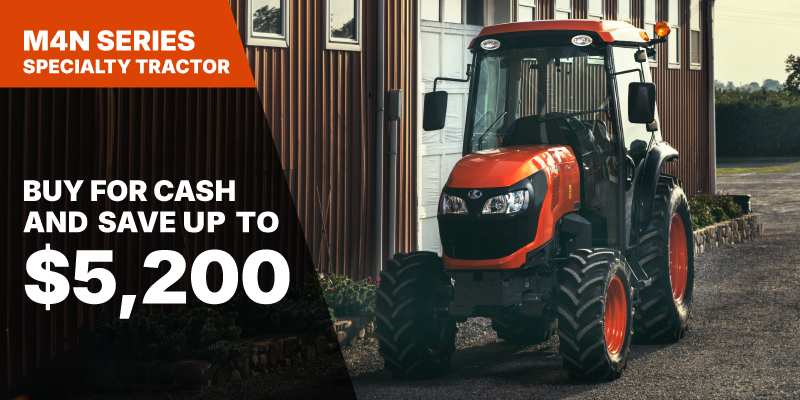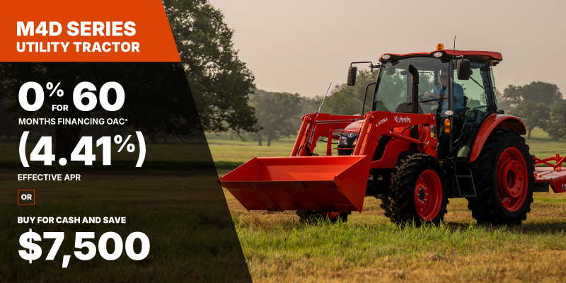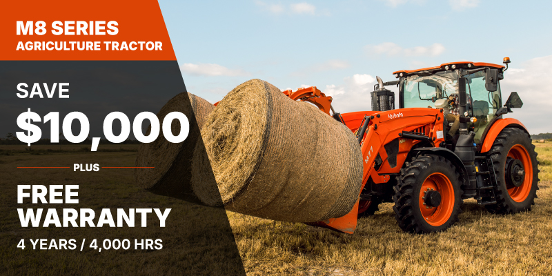 M8 Discount shown available on a new and previously unregistered M8 is $10000.00. Offer cannot be applied on past transactions, and has no cash surrender value. The 4 year/4,000h warranty on M8 offer is only valid in Canada on products distributed by Kubota Canada Ltd. Discount(s) apply before tax. Offer cannot be applied on past transactions, and has no cash surrender value. Offer valid until 06-30-2026.