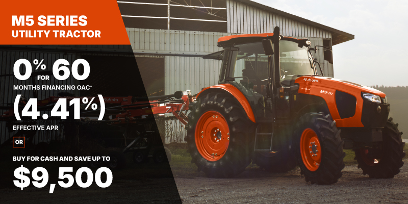 M5 Representative finance example for the M5-091HDRC: $88,473.79 financed at 12% (4.41% effective APR which factors in $8,388.14 in non stackable cash that cannot be combined with finance offers) equals $1344.25 monthly for 60 months. $8,961.69 down payment required. Cost of borrowing is $8,388.14 for a total obligation of $88,473.79. Financing available on approved credit. Prices and payments include freight and other applicable fees (including environmental fees, administration fees, set-up fees, and dealer fees on the model specified). Rebate of $7,500 on a available on cash purchases of a new M5 Rops only. Rebate of $9,500 available on cash purchases of a new M5 Cab only. Offer valid until 06-30-2026.