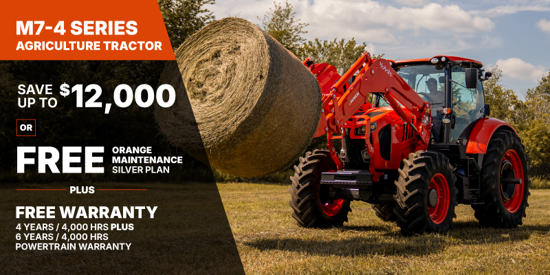 M7-4 Discount(s) available on a new and previously unregistered M7-4 Deluxe is $10,000.00, on a M7-4 Premium is $12,000.00. For details on the Silver - Orange Maintenance Plan refer to the Orange Maintenance brochure. The 4 year/4,000h and 6 years/ 4,000h powertrain warranty on M7-4 offer is only valid in Canada on products distributed by Kubota Canada Ltd. This warranty offer leads the industry for tractors sized 120-170HP for hours and length of time. Discount(s) apply before tax. Offer cannot be applied on past transactions, and has no cash surrender value. Offer valid until 06-30-2026.