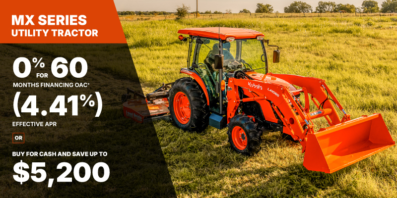MX Representative finance example for the MX5400HSTCC: $63,808.23 financed at 0% (4.41% effective APR which factors in $6,134.80 in non stackable cash that cannot be combined with finance offers) equals $983.14 monthly for 48 months. $6,554.28 down payment required. Cost of borrowing is $6,134.80 for a total obligation of $63,808.23. Financing available on approved credit. Prices and payments include freight and other applicable fees (including environmental fees, administration fees, set-up fees, and dealer fees on the model specified). Rebate of $4,000 available on cash purchases of a new MX Rops only. Rebate of $5,200 available on cash purchases of a new MX Cab only. Offer valid until 06-30-2026.
