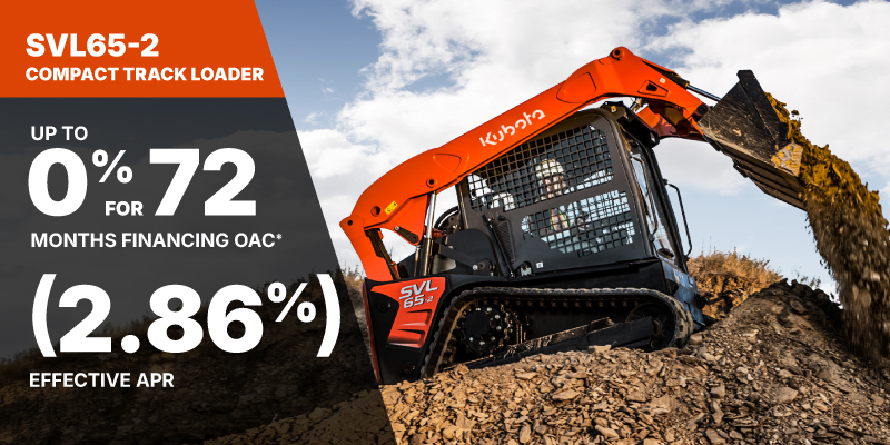 SVL65-2 Representative finance example for the SVL65-2: $95,275.17 financed at 0% (2.86% effective APR which factors in $5,945.17 in non stackable cash that cannot be combined with finance offers) equals $1429.13 monthly for 72 months. $9,527.52 down payment required. Cost of borrowing is $5,945.17 for a total obligation of $95,275.17. Financing available on approved credit. Prices and payments include freight and other applicable fees (including environmental fees, administration fees, set-up fees, and dealer fees on the model specified). 0% for 60 months available only on SVL65-2 models Offer valid until 06-30-2026.