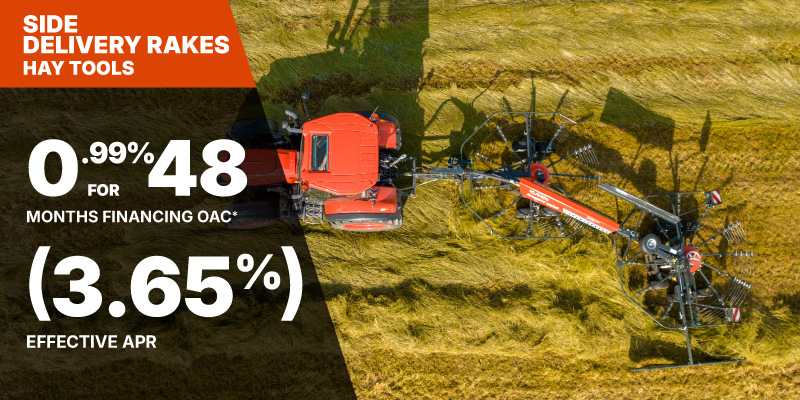 Side Delivery Rakes Representative finance example for the RA2071EVO: $41,066.54 financed at 0.99% (3.65% effective APR which factors in $2,092.31 in non stackable cash that cannot be combined with finance offers) equals $838.26 monthly for 48 months. $4,470.74 down payment required. Cost of borrowing is $2,092.31 for a total obligation of $41,066.54. Financing available on approved credit. Prices and payments include freight and other applicable fees (including environmental fees, administration fees, set-up fees, and dealer fees on the model specified). Offer valid until 06-30-2026.