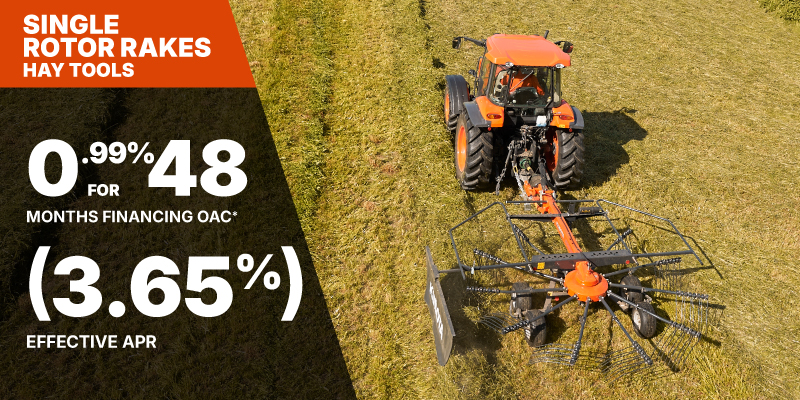 Single Rotor Rakes Representative finance example for the RA1035: $12,711.06 financed at 0.99% (3.65% effective APR which factors in $614.06 in non stackable cash that cannot be combined with finance offers) equals $246.02 monthly for 48 months. $1,312.09 down payment required. Cost of borrowing is $614.06 for a total obligation of $12,711.06. Financing available on approved credit. Prices and payments include freight and other applicable fees (including environmental fees, administration fees, set-up fees, and dealer fees on the model specified). Offer valid until 06-30-2026.