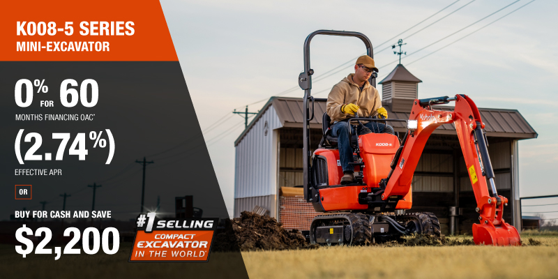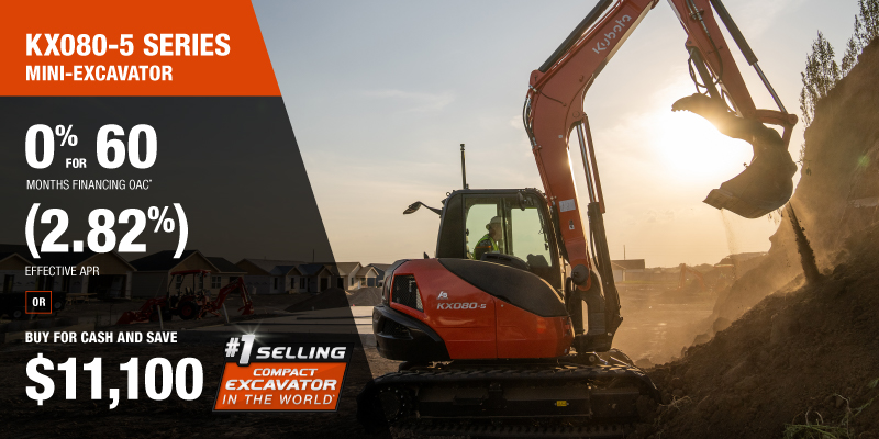 KX080-5 Representative finance example for the KX080-5: $180,598.10 financed at 0% (2.82% effective APR which factors in $11,100.00 in non stackable cash that cannot be combined with finance offers) equals $2710.28 monthly for 60 months. $18,068.53 down payment required. Cost of borrowing is $11,100.00 for a total obligation of $180,598.10. Financing available on approved credit. Prices and payments include freight and other applicable fees (including environmental fees, administration fees, set-up fees, and dealer fees on the model specified). Excavator Claim: "Kubota is the world’s #1 selling compact excavator for 20 years." Disclaimer: According to 2023 data from Off-Highway Research including all Kubota Group brand sales. Offer valid until 06-30-2026.