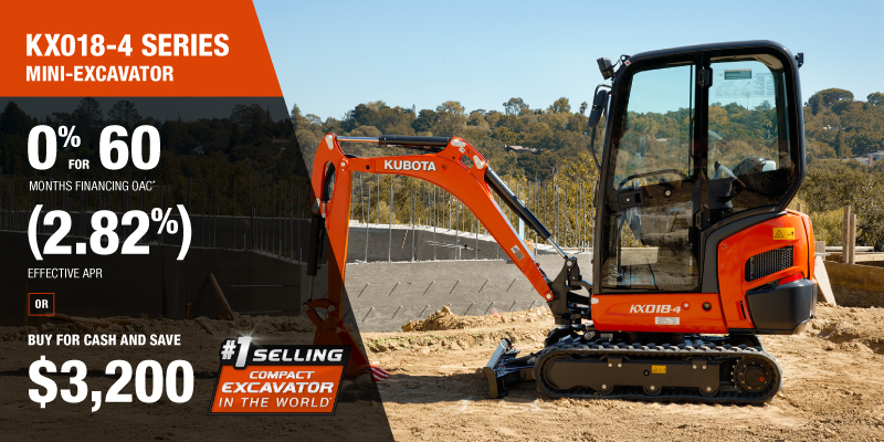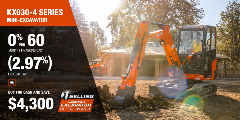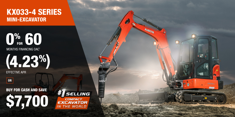KX033-4 Representative finance example for the KX033-4: $85,552.41 financed at 0% (4.23% effective APR which factors in $7,700.00 in non stackable cash that cannot be combined with finance offers) equals $1282.67 monthly for 60 months. $8,551.11 down payment required. Cost of borrowing is $7,700.00 for a total obligation of $85,552.41. Financing available on approved credit. Prices and payments include freight and other applicable fees (including environmental fees, administration fees, set-up fees, and dealer fees on the model specified). Excavator Claim: "Kubota is the world’s #1 selling compact excavator for 20 years." Disclaimer: According to 2023 data from Off-Highway Research including all Kubota Group brand sales. Offer valid until 06-30-2026.