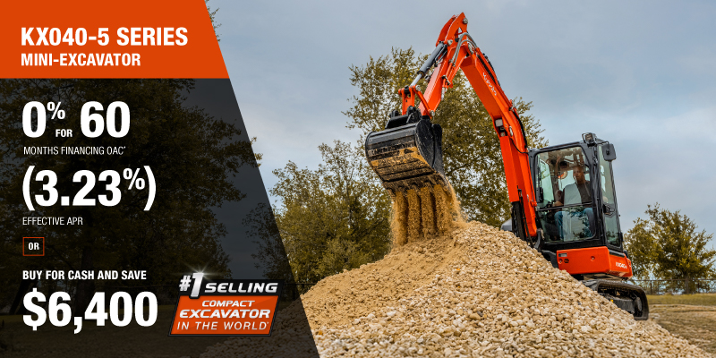 KX040-5 Representative finance example for the KX040-5: $91,349.26 financed at 0% (3.23% effective APR which factors in $6,400.00 in non stackable cash that cannot be combined with finance offers) equals $1370.9 monthly for 60 months. $9,139.32 down payment required. Cost of borrowing is $6,400.00 for a total obligation of $91,349.26. Financing available on approved credit. Prices and payments include freight and other applicable fees (including environmental fees, administration fees, set-up fees, and dealer fees on the model specified). Excavator Claim: "Kubota is the world’s #1 selling compact excavator for 20 years." Disclaimer: According to 2023 data from Off-Highway Research including all Kubota Group brand sales. Offer valid until 06-30-2026.