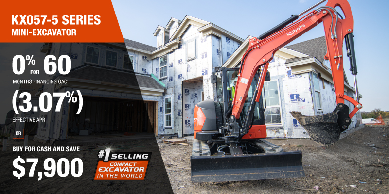 KX057-5 Representative finance example for the KX057-5: $118,641.26 financed at 0% (3.07% effective APR which factors in $7,900.00 in non stackable cash that cannot be combined with finance offers) equals $1780.48 monthly for 60 months. $11,869.84 down payment required. Cost of borrowing is $7,900.00 for a total obligation of $118,641.26. Financing available on approved credit. Prices and payments include freight and other applicable fees (including environmental fees, administration fees, set-up fees, and dealer fees on the model specified). Excavator Claim: "Kubota is the world’s #1 selling compact excavator for 20 years." Disclaimer: According to 2023 data from Off-Highway Research including all Kubota Group brand sales. Offer valid until 06-30-2026.