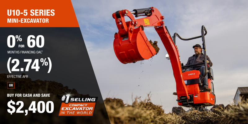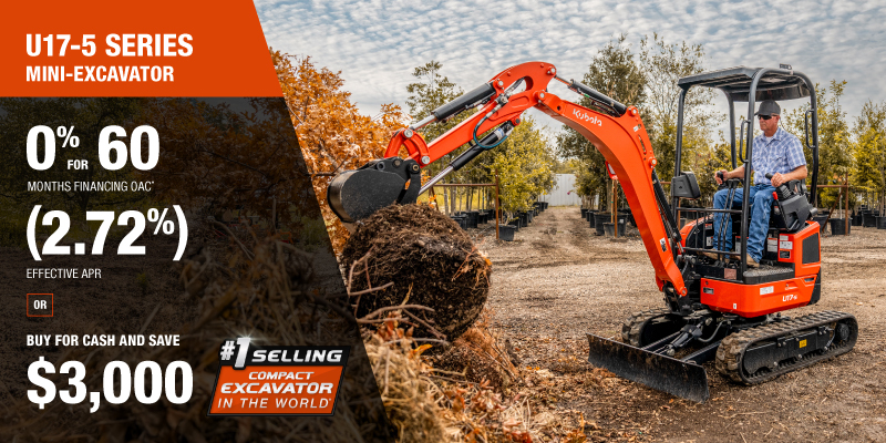 U17-5 Representative finance example for the U17-5: $50,446.13 financed at 0% (2.72% effective APR which factors in $3,000.00 in non stackable cash that cannot be combined with finance offers) equals $757.05 monthly for 60 months. $5,047.02 down payment required. Cost of borrowing is $3,000.00 for a total obligation of $50,446.13. Financing available on approved credit. Prices and payments include freight and other applicable fees (including environmental fees, administration fees, set-up fees, and dealer fees on the model specified). Excavator Claim: "Kubota is the world’s #1 selling compact excavator for 20 years." Disclaimer: According to 2023 data from Off-Highway Research including all Kubota Group brand sales. Offer valid until 06-30-2026.