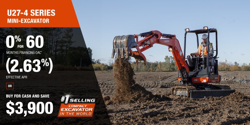 U27-4 Representative finance example for the U27-4: $67,828.75 financed at 0% (2.63% effective APR which factors in $3,900.00 in non stackable cash that cannot be combined with finance offers) equals $1017.92 monthly for 60 months. $6,786.13 down payment required. Cost of borrowing is $3,900.00 for a total obligation of $67,828.75. Financing available on approved credit. Prices and payments include freight and other applicable fees (including environmental fees, administration fees, set-up fees, and dealer fees on the model specified). Excavator Claim: "Kubota is the world’s #1 selling compact excavator for 20 years." Disclaimer: According to 2023 data from Off-Highway Research including all Kubota Group brand sales. Offer valid until 06-30-2026.