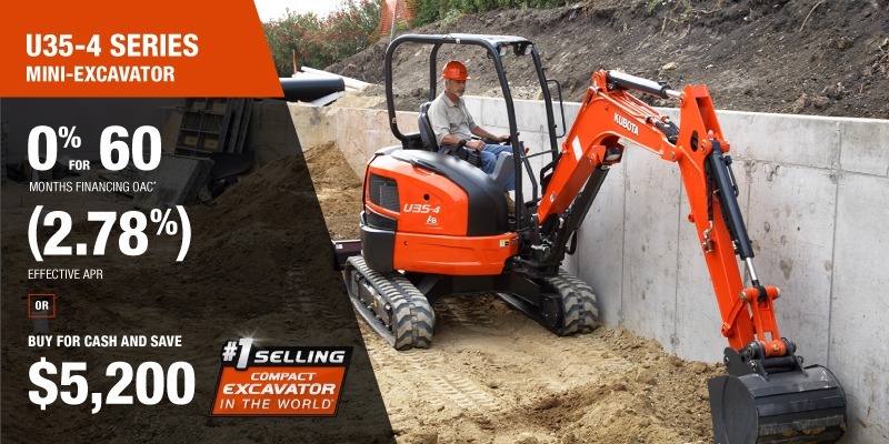 U35-4 Representative finance example for the U35-4: $85,546.39 financed at 0% (2.78% effective APR which factors in $5,200.00 in non stackable cash that cannot be combined with finance offers) equals $1283.82 monthly for 60 months. $8,558.77 down payment required. Cost of borrowing is $5,200.00 for a total obligation of $85,546.39. Financing available on approved credit. Prices and payments include freight and other applicable fees (including environmental fees, administration fees, set-up fees, and dealer fees on the model specified). Excavator Claim: "Kubota is the world’s #1 selling compact excavator for 20 years." Disclaimer: According to 2023 data from Off-Highway Research including all Kubota Group brand sales. Offer valid until 06-30-2026.
