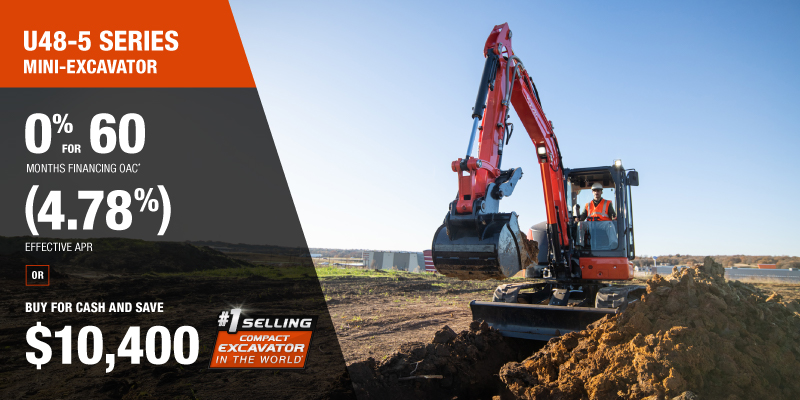 U48-5 Representative finance example for the U48-5: $102,953.69 financed at 0% (4.78% effective APR which factors in $10,400.00 in non stackable cash that cannot be combined with finance offers) equals $1545.05 monthly for 60 months. $10,300.32 down payment required. Cost of borrowing is $10,400.00 for a total obligation of $102,953.69. Financing available on approved credit. Prices and payments include freight and other applicable fees (including environmental fees, administration fees, set-up fees, and dealer fees on the model specified). Excavator Claim: "Kubota is the world’s #1 selling compact excavator for 20 years." Disclaimer: According to 2023 data from Off-Highway Research including all Kubota Group brand sales. Offer valid until 06-30-2026.