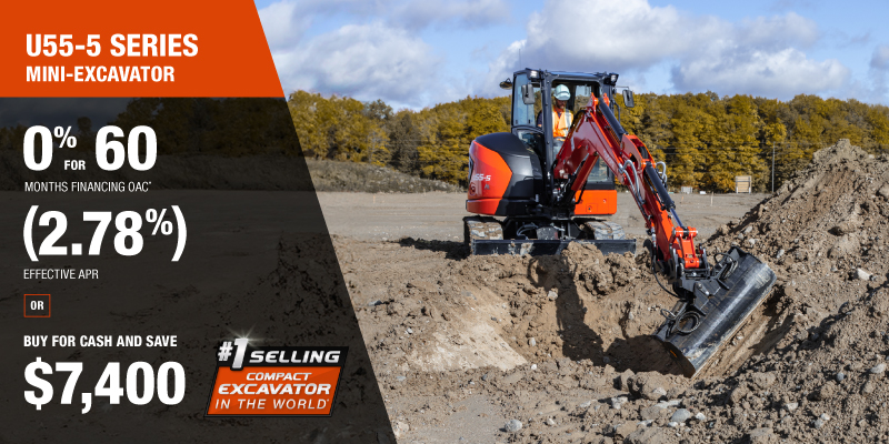 U55-5 Representative finance example for the U55-5: $122,059.55 financed at 0% (2.78% effective APR which factors in $7,400.00 in non stackable cash that cannot be combined with finance offers) equals $1831.78 monthly for 60 months. $12,211.84 down payment required. Cost of borrowing is $7,400.00 for a total obligation of $122,059.55. Financing available on approved credit. Prices and payments include freight and other applicable fees (including environmental fees, administration fees, set-up fees, and dealer fees on the model specified). Excavator Claim: "Kubota is the world’s #1 selling compact excavator for 20 years." Disclaimer: According to 2023 data from Off-Highway Research including all Kubota Group brand sales. Offer valid until 06-30-2026.